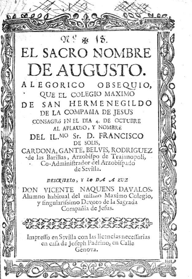 La tradición del teatro jesuítico en Sevilla se remonta al siglo XVI y continúa su trayectoria a lo largo de toda la historia de la Compañía de Jesús en esta ciudad. El 4 de octubre de 1749, tuvo lugar un “espectáculo admirable que franqueó a ojos, oídos e ingenios”, con el que se celebró el nombramiento de Francisco de Solis Folch de Cardona como coadministrador del arzobispado de Sevilla, el cual, en 1755, sería nombrando como titular en el cargo.
