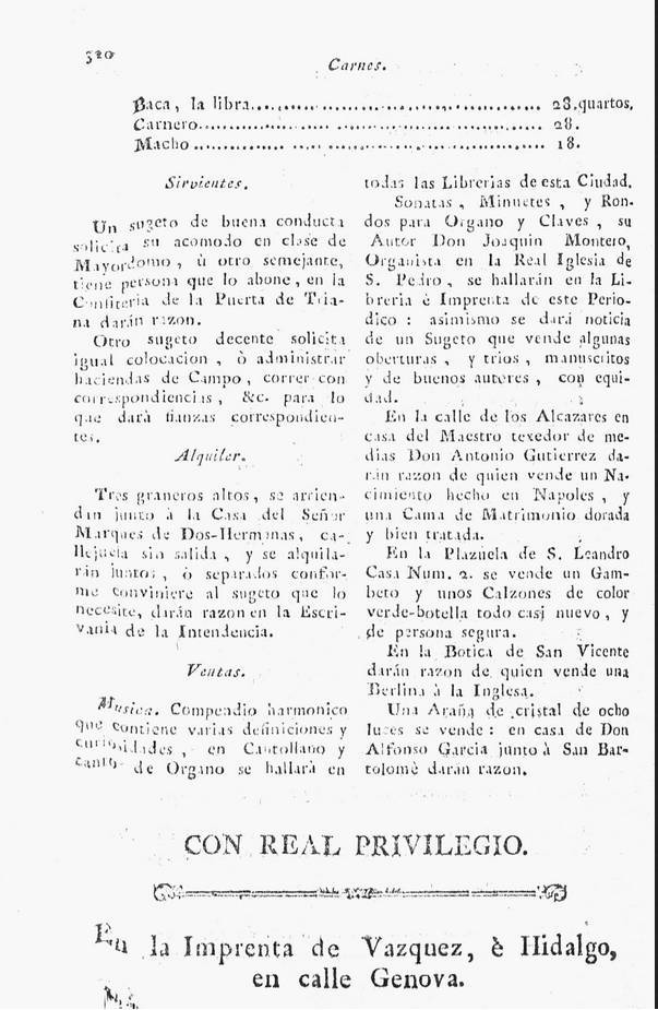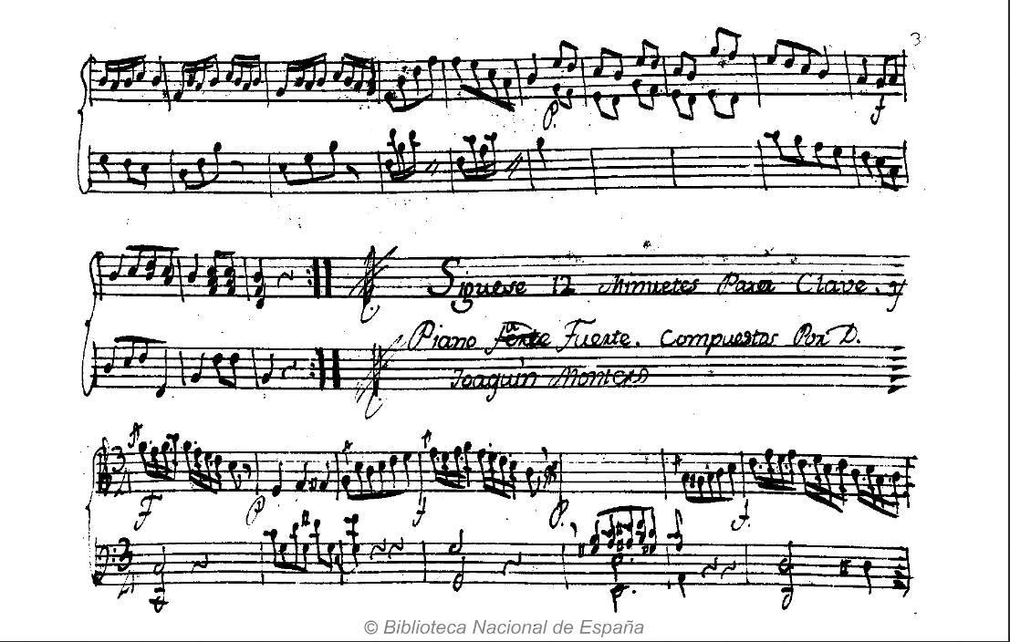 “Sonatas y minuetes para forte-piano, por D. Joachin Montero, organista en la Real Iglesia de S. Pedro de Sevilla. Se hallarán en la Librería de Hurtado, calle de las Carretas [Madrid]; en Valencia, en la de Mallén, y en Sevilla en la de Vázquez”.