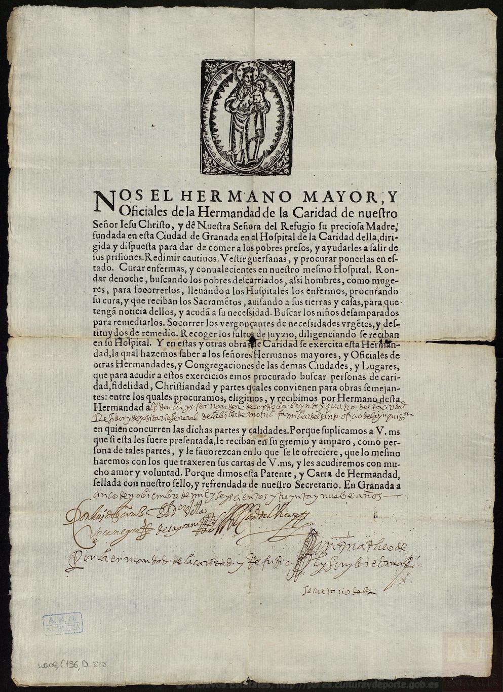 En los fondos de Archivo de los Condes de Luque, consultables en el Archivo Histórico de la Nobleza de Toledo, se ha conservado la carta de hermandad de la cofradía de la Caridad y Refugio otorgada a Luis [Gabriel] Fernández de Córdoba, “veinticuatro de Granada y regidor y depositario de la villa de Motril”, con motivo de su ingreso en esta institución. Está fechada el 5 de noviembre de 1639 (véase recurso).