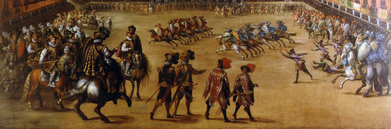 juegos de cañas (mock tournaments fought with bulrushes) , bustle in the street , animal sounds , Hieronymus Münzer (humanist) , drum player , trumpeter , wind players , Íñigo López de Mendoza y Quiñones, Second Count of Tendilla, First Marquis of Mondéjar