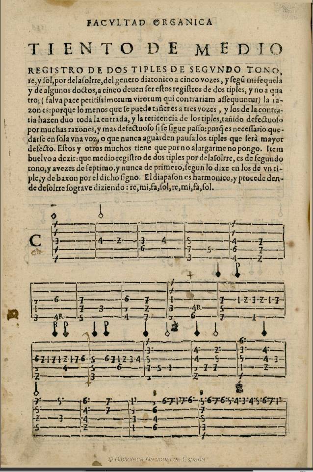 “A tañer de órgano versos de todos los tonos naturales y accidentales en término de órgano de treçe [palmos], seis obras largas y una de dos tiples y asimismo fabordones para acompañar motete de nobisdatus y acompañar contrabajos y la cifra de dicho órgano y cantar todo el canto llano y canto de órgano”.