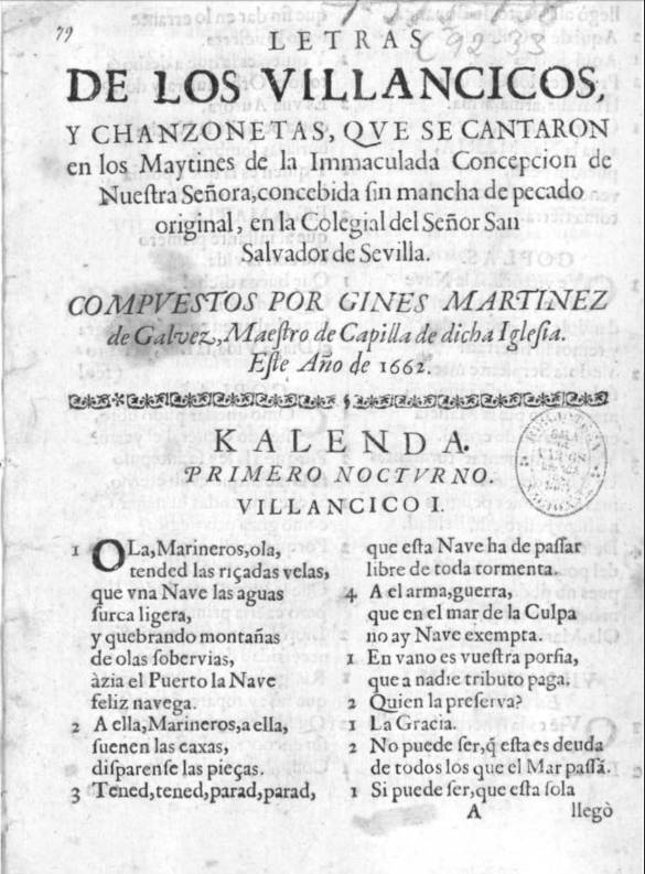 the Immaculate Conception songs (villancicos) , feast of the Conception of Mary , matins of the feast of Immaculate Conception , matins , Christmas song (villancico) , Ginés Martínez de Gálvez (chapel master) , music chapel of the collegiate church of San Salvador (Seville)