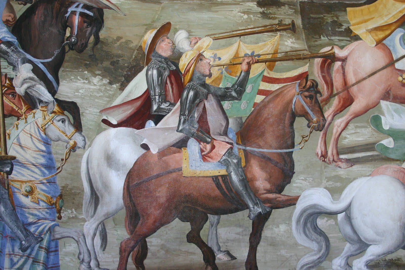 Hay que destacar el elevado número de trompetas y añafiles representados en la pintura escurialense, la mayor parte en las tropas castellanas y cada una con su divisa, entre las que pueden verse claramente las de Álvaro de Luna (un menguante y pie de plata en campo de gules), las del rey Juan II (castillos y leones) y las del III conde de Benavente, Alonso Pimentel y Enríquez (veneras de plata en campo de sinople / barras de gules). Claramente se ve otra divisa con flores de lis azules en campo de oro que no he podido identificar como perteneciente a alguno de los títulos nobiliarios presente en el enfrentamiento. Se corresponde con las armas del duque de Parma y Plasencia. Podría tratarse de un “gesto” de Felipe II hacía su sobrino, Alejandro Farnesio, III duque de Parma, en ese momento gobernador y general de los ejércitos de Flandes. Los atabales están presentes en ambos bandos y uno de los jinetes toca lo que parece una especie de atambor o pandero.