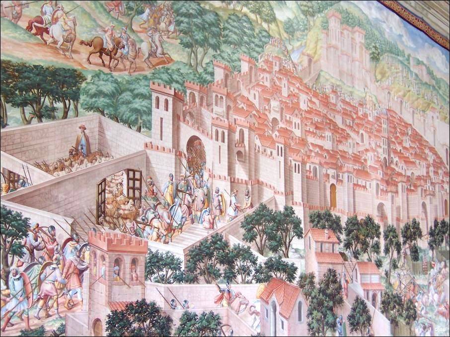 “En esta galería [del monasterio de El Escorial], en el muro de la iglesia en todo él está pintada la batalla que dicen de la Higueruela que el rey Don Juan el II dio a los moros de Granada en la mesma Vega; está al natural de como pasó, y la orden que tenían en el asiento del real, y los trajes de los hombres de armas, ginetes y esquadrones de lancería, paveses y ballestería, como entonces se usaba; sacose de una pintura de un lienzo que se halló en una torre antigua del Alcázar de Segovia que tenía de largo ciento treinta pies [36’2 metros], hecha la pintura del mismo tiempo que se dio la batalla. Su magestad [Felipe II] la mandó pintar en esta galería, porque se conservase aquella antigüedad, que es mucho de ver y de estimar”.