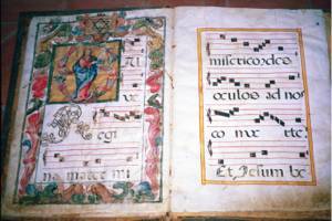 En la abadía se conservan dos libros corales que contienen la Salve: el XLII y el LXVI. El primero de ellos posee una inscripción: “Mandó hacer este libro un devoto para que se cante la Salve en estas sanctas Cuevas. Anno Domini 1697”. En otra página: “Francisco de Aguilar me fecit”.