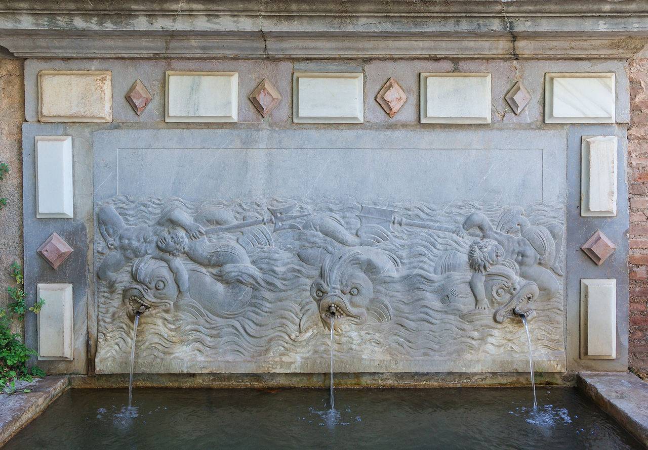 En los dos extremos del jardín se colocaron pilares, fechados en 1628, construidos en piedra de Sierra Elvira y mármol blanco, cuyas pilas son idénticas, rectangulares y con tres caños, pero con frontis muy distintos que las individualizan. El pilar adosado al torreón oeste presenta una estructura arquitectónica de fachada; el del este se caracteriza por una rica decoración con una escena marina que pudo ser realizada por Diego de Landeras y en la que encontramos esculpidos tres delfines, por cuyas bocas mana el agua, cabalgados por genios o amorcillos.