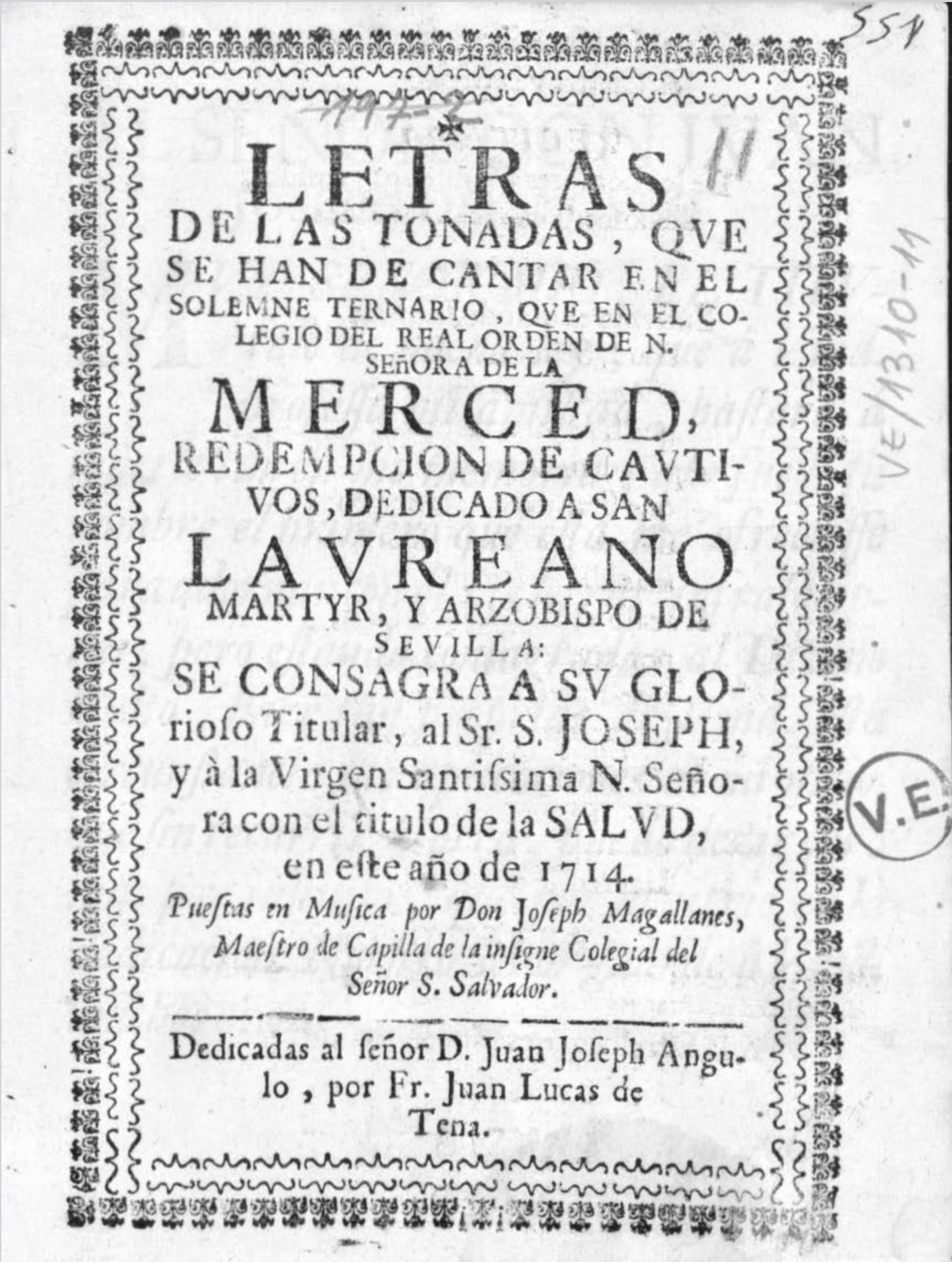 El colegio mercedario de San Laureano inició su azarosa andadura a principios del siglo XVII en el barrio de los Húmeros. En su construcción se usó parte de la antigua residencia de Hernando Colón. En 1714, el colegio organizó un solemne ternario dedicado a su titular San Laureano, a San José y a Nuestra Señora de la Salud. En los actos cultuales se cantaron tres “tonadas” / “cantadas” alusivas a cada uno de ellos que probablemente fueron interpretadas sucesivamente a lo largo de los tres días. El autor de los textos fue fray Juan Lucas de Tena que lo dedica a Juan José de Angulo. La música fue compuesta por José Magallanes que, en ese momento, era maestro de capilla de la colegiata del Salvador de Sevilla, capilla que posiblemente también fuera la responsable de su interpretación. Se trata de tres cantadas que incluyen las habituales secciones de influencia italiana: grave, recitado, arieta, etc.