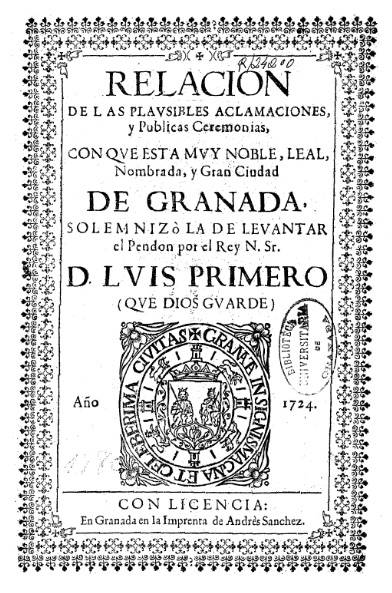 La noticia de la abdicación del rey Felipe V en su hijo Luis I y su proclamación como rey se recibió en Granada en el correo ordinario del lunes 7 de febrero de 1724. En esta “cartaorden” se mandaba: “que en consecuencia de ella levante los Pendones, que en semejantes casos acostumbra, aclamando su Real Nombre”.