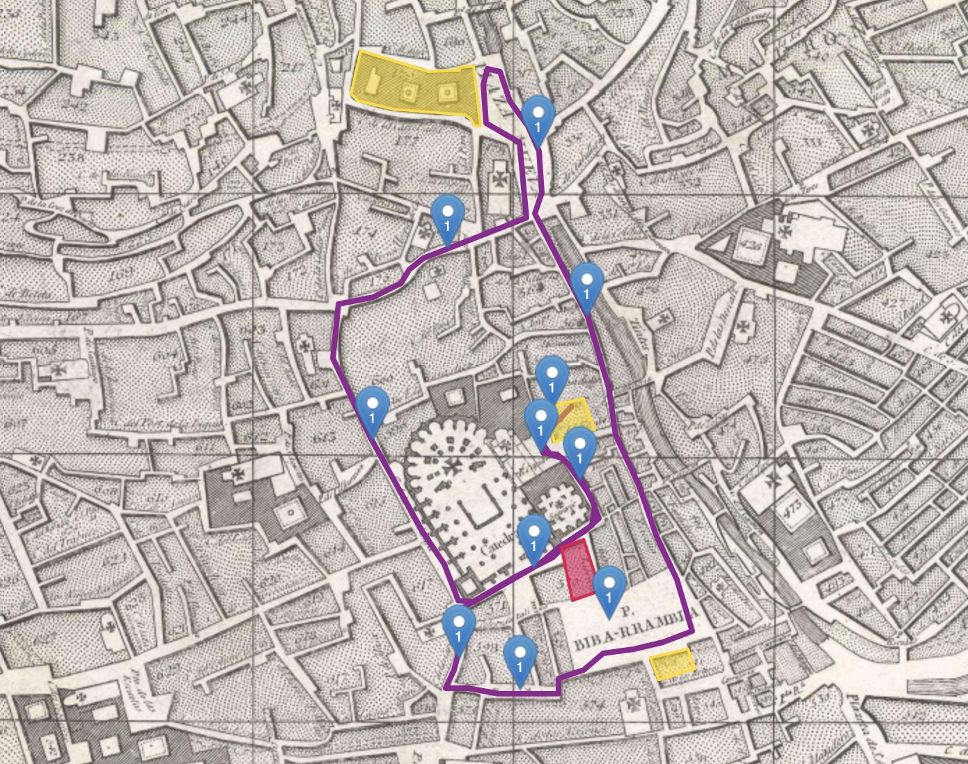 El itinerario recorrido hasta el tablado de Bibarrambla fue el siguiente: “bajando por la [calle] de la Lonja y la de la audiencia arzobispal y por la que llaman de los Colegios, se entró a la de las Capuchinas, para salir a la Pescadería y a la plaza mayor [Bibarrambla]. El tablado estaba decorado de vistosas sedas y alfombras. Los reyes de armas, el escribano mayor, Dionisio Antonio de Torres Monteagudo, el conde de Luque y el corregidor, desmontaron e hicieron una profunda reverencia ante un retrato del monarca Luis I colocado en la casa de los Miradores, debajo de un dosel de terciopelo carmesí con galones de oro, escoltado por una compañía de milicias. Subieron al tablado y los reyes de armas dieron comienzo a la proclamación: “dijeron en altas voces: Silencio, silencio, silencio. Oíd, oíd, oíd. Y prevenida la atención de tan grande auditorio con este aviso, dio al aire las suyas el señor alférez mayor, diciendo: Castilla, Castilla, Castilla, por el católico rey don Luis Primero, nuestro señor, que Dios guarde muchos años. Tremolando tres veces el pendón real, ceremonia que se repitió en los cuatro lado del tablado en cuya parte central se habían colocado sendos escudos con las armas reales. A continuación, el intendente y el alférez mayor arrojaron una buena cantidad de monedas por las que el pueblo debió pelear, “reiterando complacido las plausibles aclamaciones de Viva, las que confundían los sonoros clarines y abúes, tambores y timbales, el incesante repique de las campanas y el horroroso estruendo de la artillería de la Alhambra, prevenida para este efecto con el permiso del alcaide de aquella fortaleza”. En las ventanas del palacio arzobispal, se encontraba el arzobispo, Francisco de Perea y Porras, acompañado del cabildo.