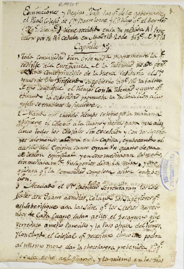 Pag. 1. Cap. 1.2. “Mando que en todo tiempo se toque por la mañana y dispierte el colegio a las cuatro y media para que a las cinco todos los colegiales sin excebçión y con dos superiores a lo menos estén en la capilla e invocando el auxilio del Espíritu Santo. Oirán un cuarto de hora de lección espiritual y en otro meditarán sobre ello e inmediatamente un superior dirá la misa y otro cuidará que la comunidad completa asista con devoción.”