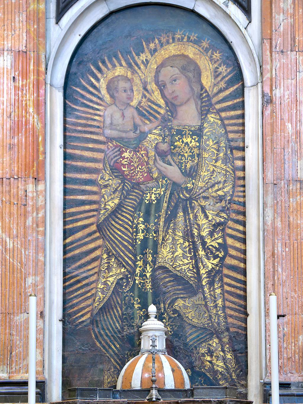 La pintura mural de la Virgen del Coral es uno de los tres ejemplos más tempranos de pintura gótica sevillana conservados. Envuelta en legendarios orígenes, data de la segunda mitad del siglo XIV y se encontraba pintada en uno de los paramentos de la antigua iglesia gótico-mudéjar. Presenta una significativa influencia de la pintura sienesa del Trecento y se especula que pudo pintarse por algún artífice relacionado con la importante comunidad italiana afincada en la ciudad.