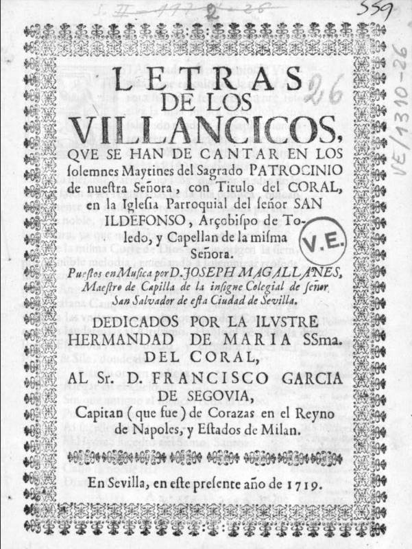 Se han conservado las letras de los villancicos que se cantaron en los Maitines de la festividad del “Sagrado Patrocinio de Nuestra Señora con título del Coral” de 1719, celebrados en su altar de la iglesia de San Ildefonso. La música fue compuesta por José Magallanes que, en esa fecha, era maestro de capilla de la colegiata del Salvador, cuya capilla musical debió ser la encargada de interpretarlos y de asistir al resto de actos cultuales de la fiesta, entre ellos, probablemente, las Vísperas y la Misa. Están dedicados a Francisco García de Segovia que había sido capitán de los caballos corazas en el reino de Nápoles y estados de Milán. Son nueve villancicos en los que encontramos estructuras tradicionales con introducción-estribillo-coplas (2, 4, 6, 7, 9) y otras de influencia italiana (1, 3, 5 y 8) que se denominan cantadas, con recitativos, arias, minuet, etc.