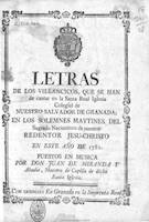 En 1714, Antonio Navarro, maestro de capilla de la colegiata del Salvador de Granada, propone al cabildo la impresión del texto de los villancicos para los Maitines de la fiesta de Navidad, costumbre establecida ya desde el siglo XVII en la catedral y capilla real de esa ciudad. Esta sugerencia no fue aprobada y las primeras noticias de la impresión de villancicos en la colegiata del Salvador dimanan de los pliegos impresos en 1723, uno de los escasos ejemplares conservados de los villancicos que se imprimieron para esta institución. Véase http://www.historicalsoundscapes.com/evento/340/granada/es.