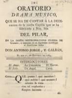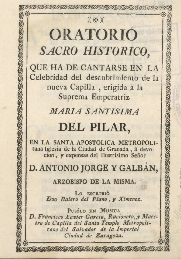 * El impreso con el texto del primero de ellos, Oratorio Sacro Histórico, nos informa que fue compuesto para “cantarse en la celebridad del descubrimiento de la nueva capilla, erigida a la suprema emperatriz María Santísima del Pilar” de la catedral de Granada, “a expensas del arzobispo”. Da cuenta del autor del texto y del compositor de la música: “D. Francisco Xavier García, racionero y maestro de capilla del santo templo metropolitano del Salvador de la imperial ciudad de Zaragoza”. Francisco Javier García Fajer fue un destacado compositor de oratorios en la Zaragoza de la segunda mitad del siglo XVIII. En este oratorio hay un una sucesión de arias solistas y un “recitado y aria a dúo, al gozo que explica Granada en el descubrimiento de la capilla”.
