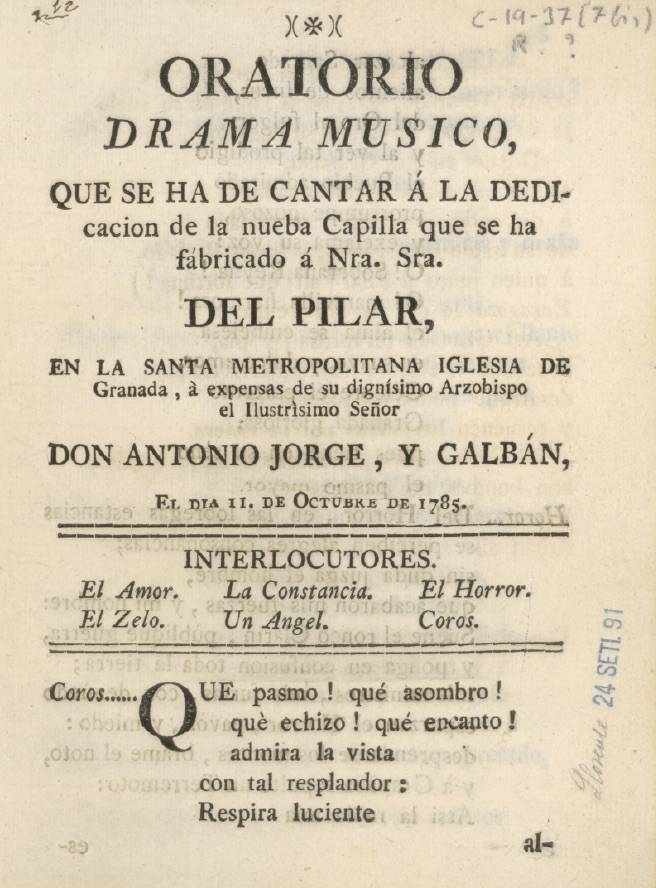 Oratorios for the inauguration of the Pilar Chapel in Granada Cathedral (1785)