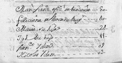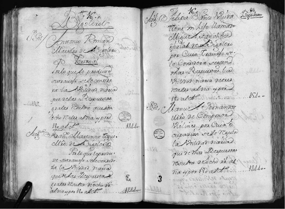 * Antonio Román, maestro de violero (42 años). Vivía con Ana Delgado, su mujer, de 30 años y con sus hijas Ana y María de 10 y 4 años respectivamente. Probablemente fuera el veedor del oficio de violeros, ya que se le nombra para que fuera el encargado de determinar las “utilidades” que tenían los integrantes del gremio de violeros y caroqueros.