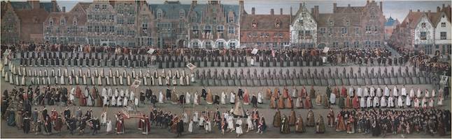En este evento, me centraré en la procesión que tuvo lugar en 1549, especialmente en sus elementos sónicos, basándonos en la descripción del cronista Juan Calvete de Estrella que fue testigo presencial de la misma. La procesión tuvo lugar el 2 de junio de 1549, el domingo después de la Ascensión. El emperador, el príncipe “y las reinas con sus damas” fueron al ayuntamiento (“casa de la villa”): “a ver una solemnísima procesión que se hace cada año por la villa… en memoria de una devotísima y antiquísima imagen que tienen de Nuestra Señora en un templo muy sumptusoso, que llaman del Sablón”. Allí, los miembros de la corporación ciudadana les tenían preparada un banquete que se serviría tras el paso del desfile. La procesión salió a las 8 de la mañana de Onze-Lieve-Vrouw-ter-Zavelkerk (iglesia de Santa María del Sablón). Como es habitual, Calvete de Estrella describe con toda minuciosidad los integrantes del cortejo procesional: