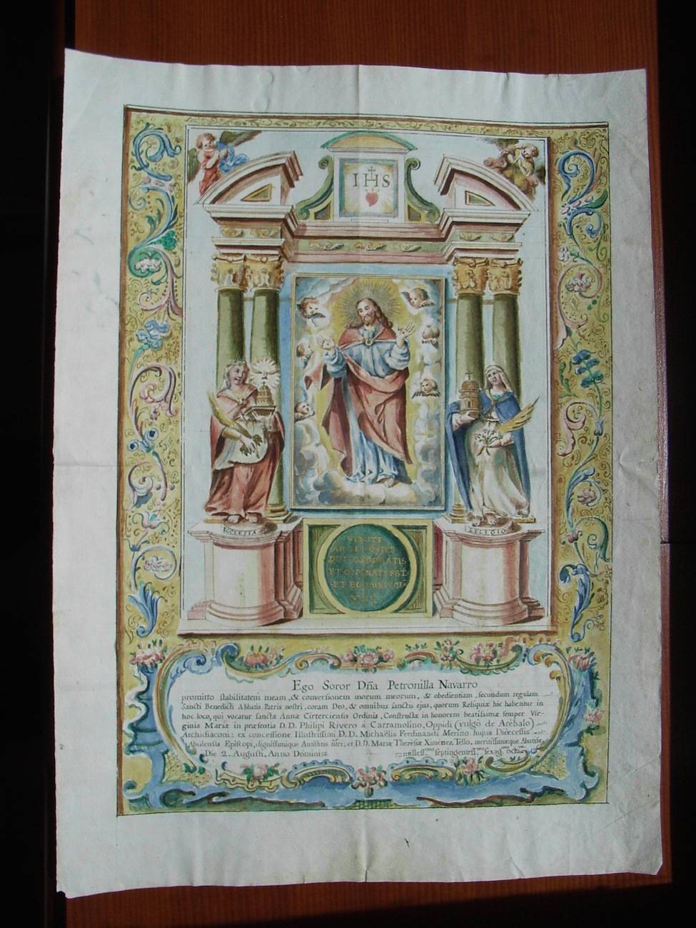 Resulta especialmente original y atractiva la de Petronila Navarro, de 1768, pues es una completísima traza a todo color de un retablo clásico en mármoles, con dobles columnas corintias y frontón curvo partido que enmarcan una pintura del Sagrado Corazón de Jesús; delante de las columnas, a modo de esculturas, las imágenes de la Iglesia y la Religión. De esta monja también conocemos las escrituras hechas ante notario, el 15 de julio de 1767 de recepción y dote (600 ducados, más 300 reales por alhajas de sacristía, ajuar y 50 ducados y 12 fanegas de trigo para alimento del año de noviciado), y el 30 de julio del año siguiente de carta de pago y renuncia de herencia.