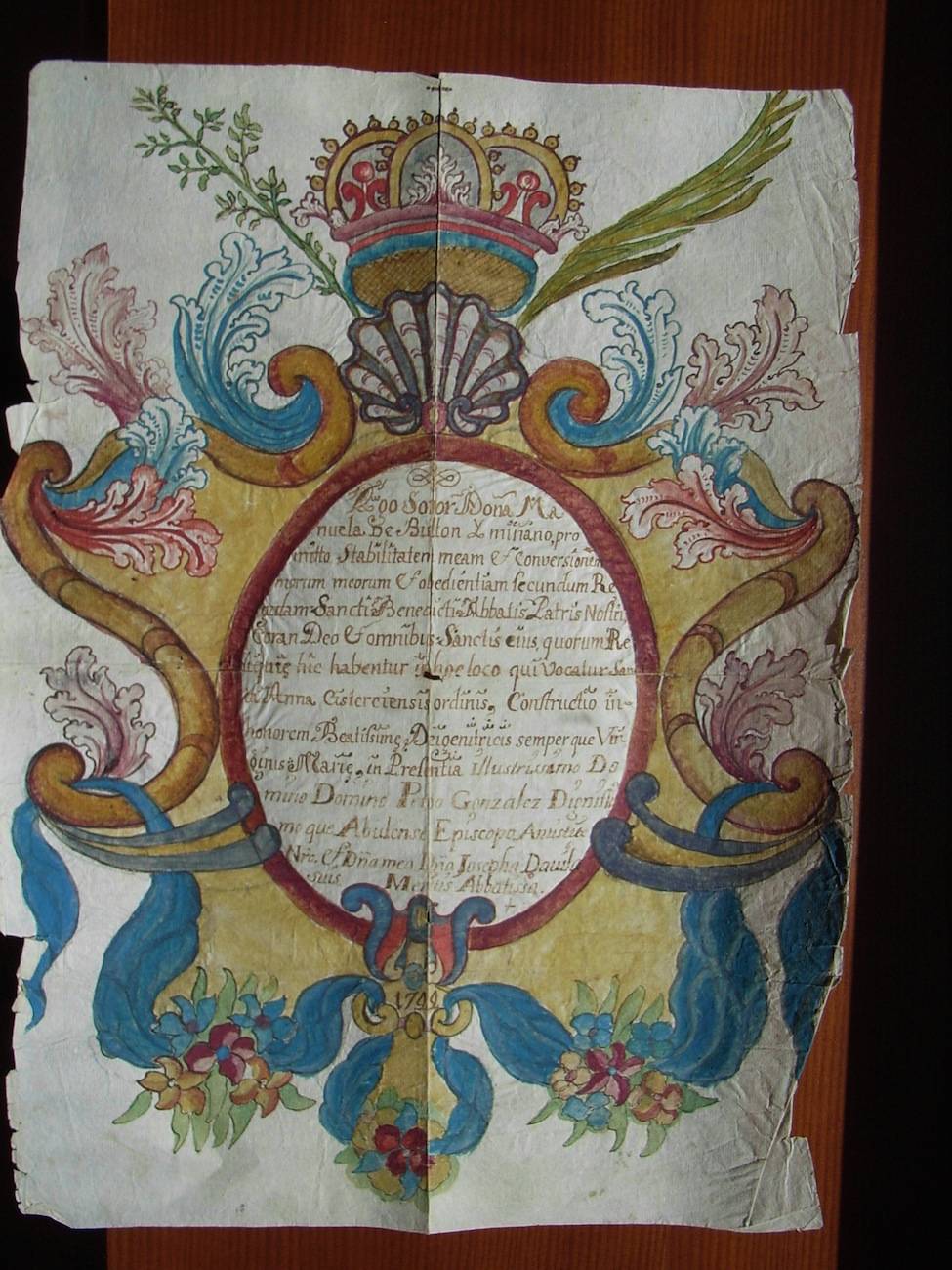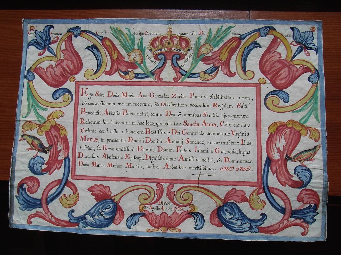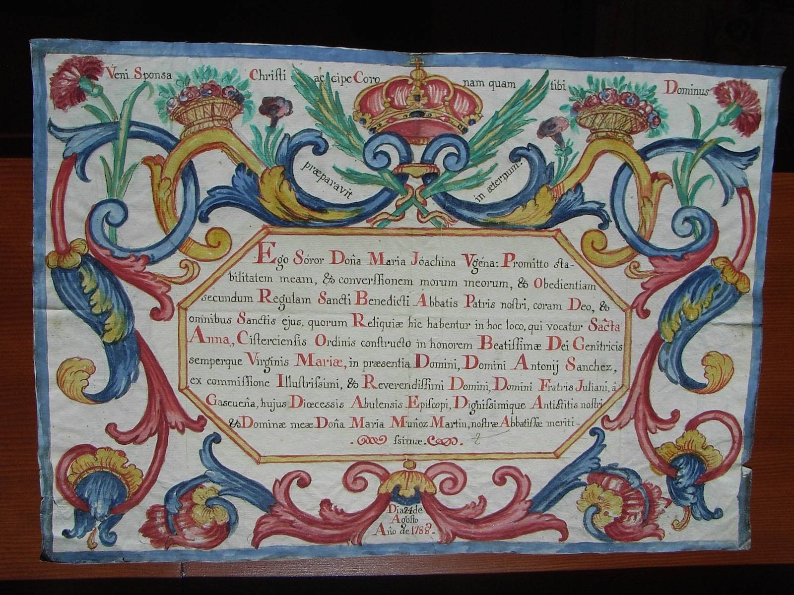 El rico archivo de partituras conservado en el monasterio cisterciense de Santa Ana, en Ávila, es reflejo de una esplendorosa actividad musical protagonizada sobre todo por las propias monjas cantoras, organistas, arpistas, violinistas y pianistas. Por lo que se ha conservado (sobre todo del siglo XVIII), esa actividad fue casi exclusivamente litúrgica; solo la música para tecla indica una finalidad lúdica o didáctica. Una de las ceremonias más propias del monasterio fue la de la profesión de las monjas, normalmente un año después de la toma de hábito, celebración un poco menos solemne. La importancia de este acto, que suponía el cambio de estado de una mujer de seglar a monja para el resto de su vida, generó documentos de diverso tipo algunos de los cuales han llegado a nuestros días: actas notariales de entrega de dotes y renuncia de herencias, libros de tomas de hábito, de profesiones y de defunciones, cédulas de profesión, composiciones poéticas y musicales interpretadas en la ceremonia...