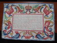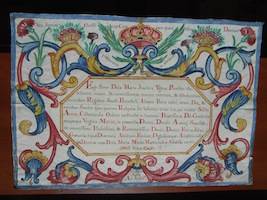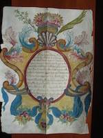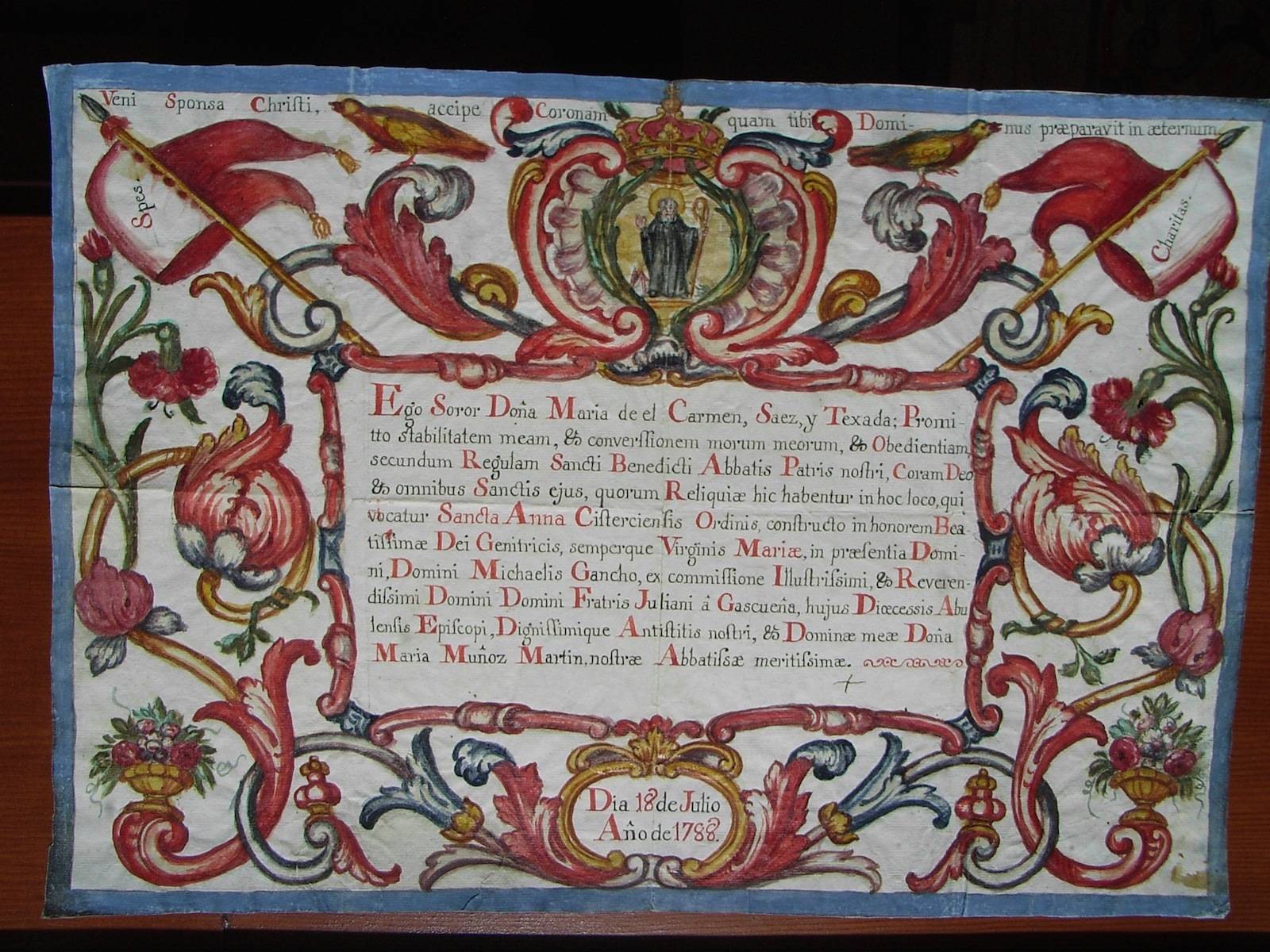 Además de estas partituras, que constituyen el elemento sonoro singular de esos momentos, se han conservado también las decoradas cédulas de profesión de estas cinco monjas (una de las arias es para la profesión de dos monjas). Se trata de un texto formulario en latín con el nombre de la monja que hace la promesa y de la abadesa y el obispo (o su representante) ante quien la hace. Pero están escritas en un doble folio en papel ornamentado con cuidadosas orlas con elementos vegetales, animales, rocallas y a veces motivos iconográficos más desarrollados.