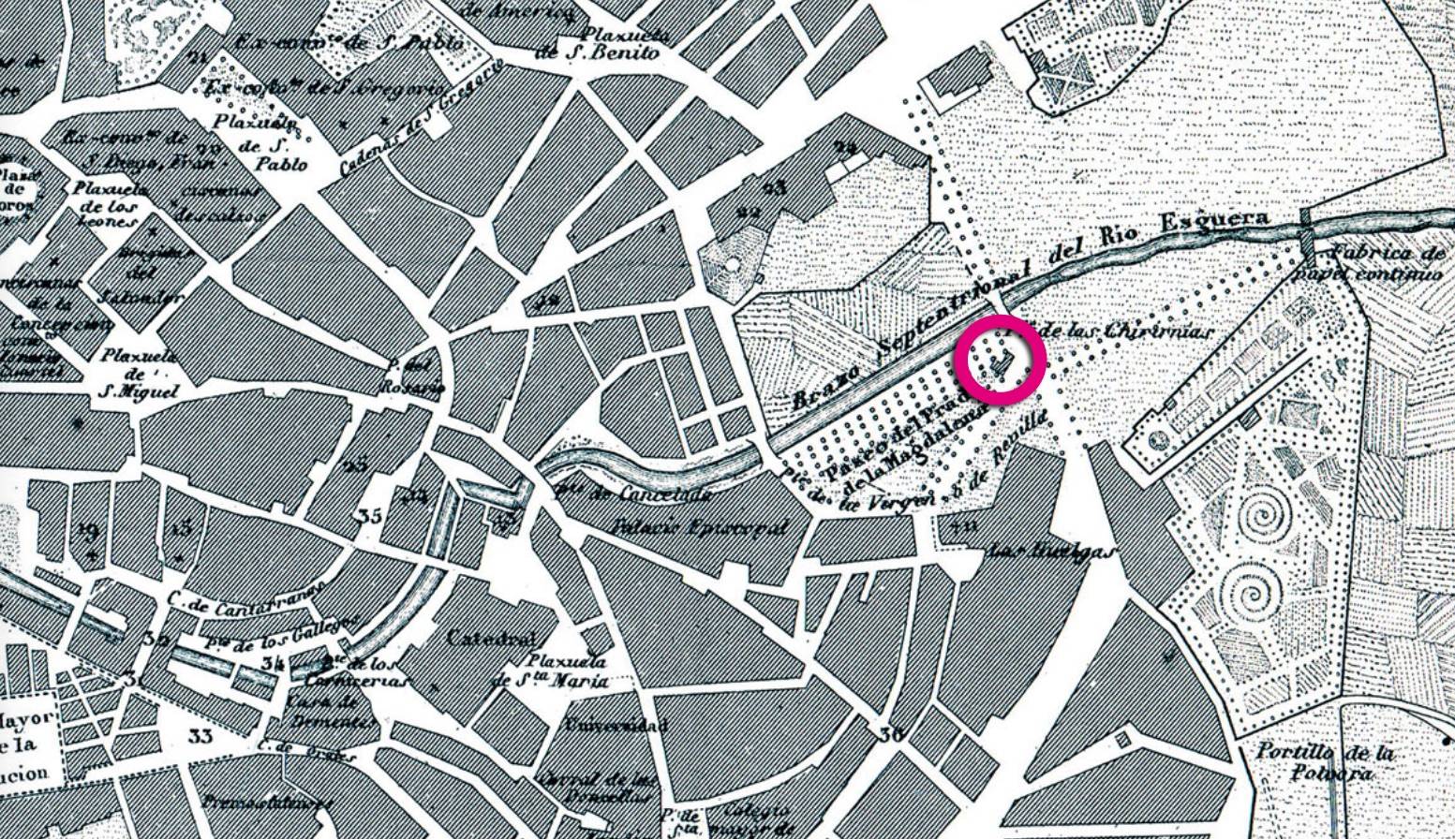 “... cerca, por lo tanto, de la casa de las Chirimías, de la que recuerdo los escudos en piedra de la ciudad, ya convertida en vivienda del guarda de aquel paraje y depósito de herramientas y útiles del trabajo propios de los que allí se realizaban”.