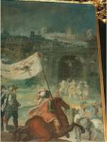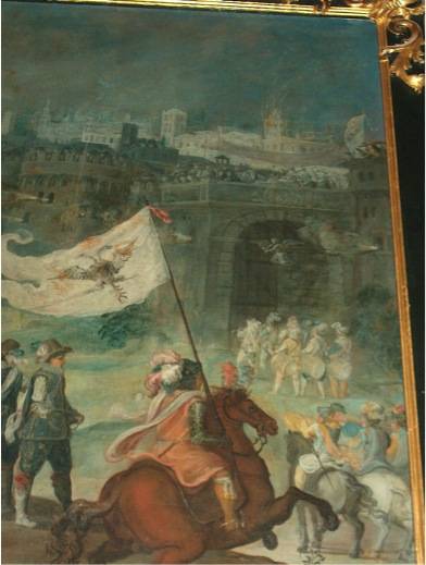 “un castillo de madera, torreado y almenado con sus puertas muy grandes y bien pintadas, todo cubierto de diversas flores y rosas y otras frescas verduras. Y al pie del dicho castillo y puertas estaba hecho de bulto Cupido con un arco grande y su flecha enarbolada. Y desde lo alto del castillo, hasta el pie del dicho bulto, estaban puestas unas cuerdas muy tirantes, y en medio de ellas, junto a las almenas del dicho castillo, puesto un niño de edad de seis o siete años, vestido de un alba de lana y su estola y alas y diadema a la manera de ángel y unas dos llaves grandes en las manos; y las puertas del castillo do había de entrar estaban cerradas, y luego que el dicho señor Gobernador llegó junto allí, el dicho ángel desde lo alto bajó por las cuerdas en el aire, y así como llegó junto a donde el Gobernador estaba, hasta el altor de su caballo, y sin ningún detenimiento, extendió las manos y le dio las llaves de la ciudad, las cuales el dicho Gobernador recibió y llevó en sus manos".