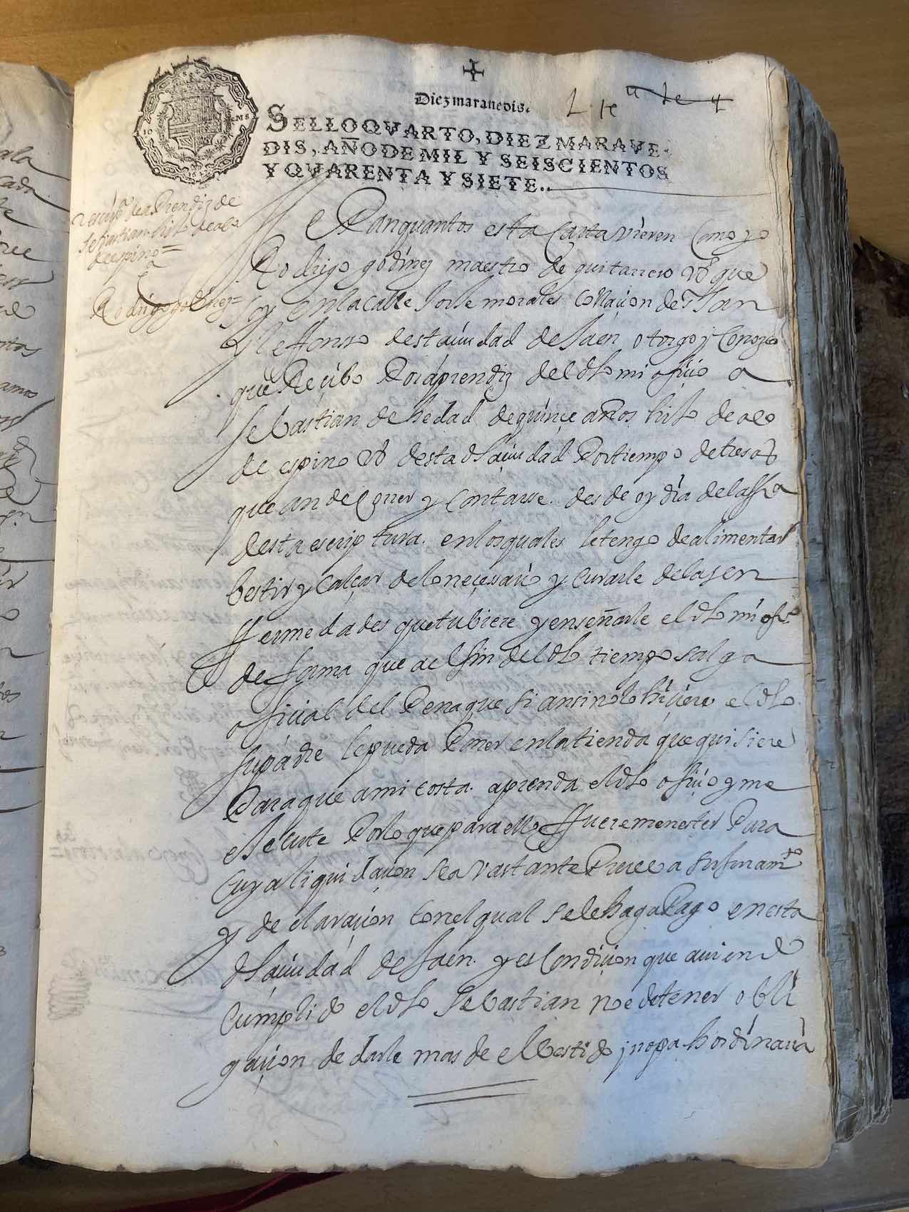 El 26 de marzo de 1647, el maestro de guitarrero Rodrigo Godínez, vecino de la collación de San Ildefonso y que tenía su casa-taller en la calle Jorge Morales, recibía por aprendiz a Sebastián, de quince años, hijo de Alonso de Espino, vecino también de Jaén. En el contrato se fijan las condiciones establecidas entre las partes. El tiempo de aprendizaje se estipula en tres años, en los cuales Godínez estaría obligado a cubrir las necesidades sanitarias, de vestuario, calzado y alimentación de su aprendiz, así como: