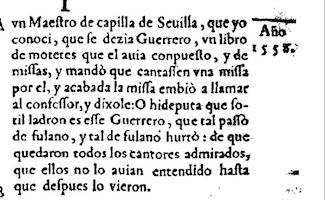 “Presentole un maestro de capilla de Sevilla que yo conocí, que se decía Guerrero, un libro de motetes que él había compuesto y de misas, y mandó que cantasen una misa por él y acabada la misa envió a llamar al confesor y dijole: O hideputa que sotil ladrón es ese Guerrero, que tal paso de fulano y tal de fulano hurtó: de que quedaron todos los cantores admirados que ellos no lo habían entendido hasta que después lo vieron”.