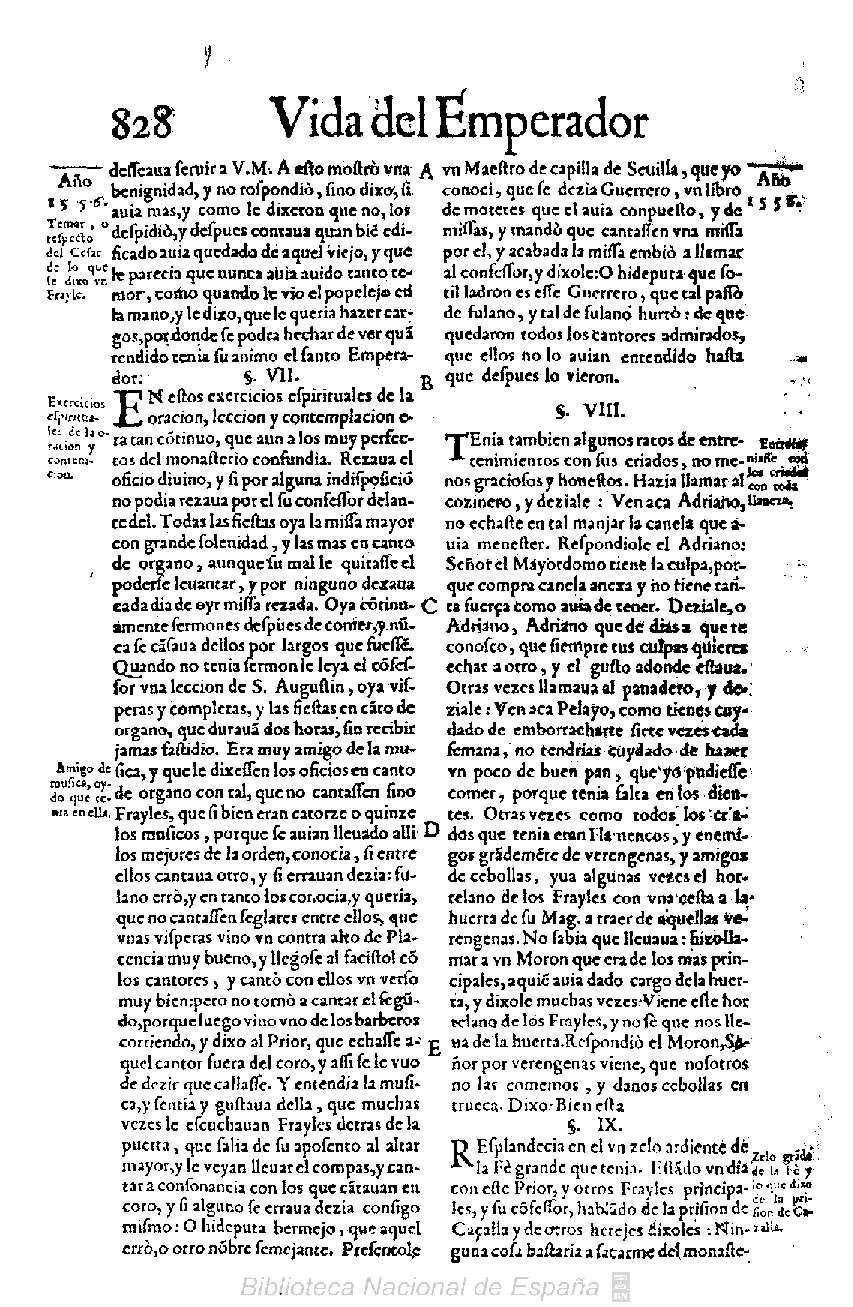 “E tienen exzemplos como huã monarca como Carlos quinto estando en São Yuste na vera de Plasençia pagando hu mestre da igreja mayor de Seuilha chamado Guerreiro por a li lhe fizera seruiçio da hu libros de miças e chãosonetas, e mandando cantar huã das miças, vio o prior estar o emperador na sua tribuna cantando huã das vozes. E fazendo o compaço, ho que mais ouue e disse que for curiozo leia a sua caroniqua”.