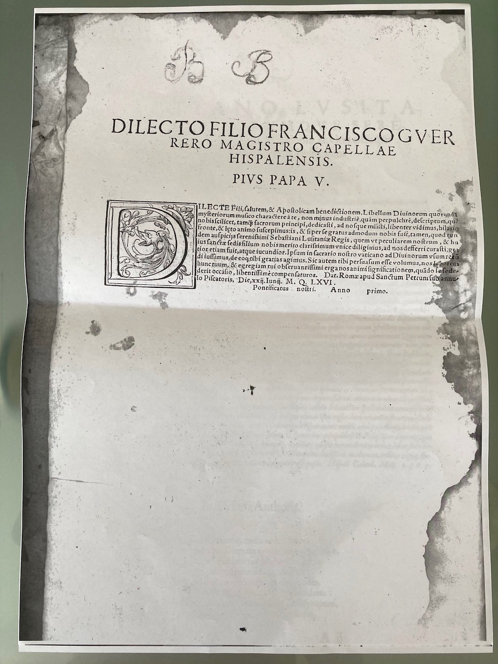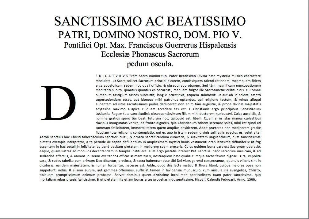 A mediados de la década de 1990, en el transcurso de una visita a la colegiata de Baza para estudiar sus fondos documentales, se localizaba un nuevo ejemplar del Liber primus missarum del que Juan Ruiz Jiménez daba noticia en un artículo publicado en 1997, el cual sigue sin registrarse en RISM más de veinte años después. Cuando el evento referido a la obra de Francisco Guerrero en la colegiata de Baza ya estaba publicado en esta plataforma digital (31/03/2020), Luis Alfonso Pérez Valera ponía en mi conocimiento que el ejemplar conservado en Baza tenía una particularidad que lo diferenciaba de los ejemplares de la Bibliothèque nationale de France y de la Österreichische Nationalbibliothek que él había consultado. La variante consistía en la incorporación de un folio, a continuación de la portada, con una dedicatoria suplementaria a la que los otros ejemplares poseían, destinada al rey Sebastián de Portugal, la cual estaba firmada el 1 de mayo de 1565. Fue en este punto cuando, de forma conjunta, comenzamos a investigar este ejemplar más en profundidad. La segunda dedicatoria, con fecha de 1 de febrero de 1566, ocupa el recto del folio y está dirigida al papa Pío V que había sido elegido solo unos días antes, el 7 de enero de 1566, lo cual no deja lugar a dudas sobre el motivo de la misma, la cual debió adjuntar manuscrita al ejemplar que le envió probablemente durante la primavera de ese año. En el verso se encuentra la respuesta del Papa a Guerrero, fechada el 22 de junio de 1566, en la que le agradecía el ejemplar del Liber primus missarum que le ofrecía (probablemente el que se conserva en la Biblioteca Apostólica Vaticana). Una copia de esta respuesta fue localizada por José María Llorens Cisteró en el Archivo Apostólico Vaticano (arm. 42, t. 26, f. 88) y publicada en el vol. IV de la Opera Omnia del compositor (p. 29).