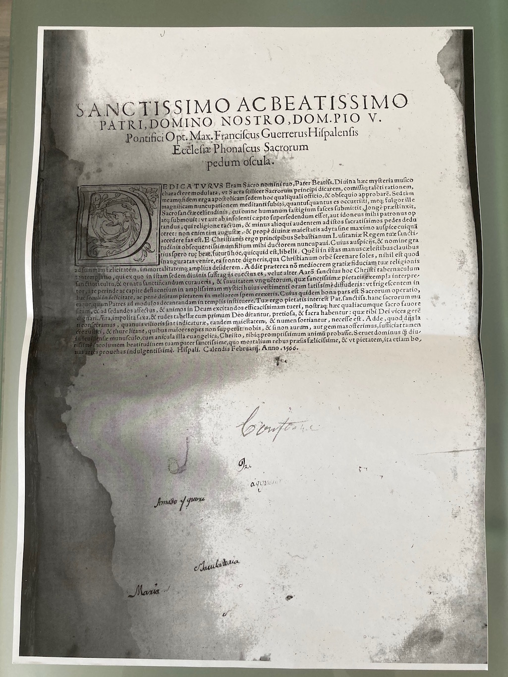 Este ejemplar presenta un extraordinario interés, ya que como se ha estudiado detenidamente en otro artículo es una emisión de la edición de este impreso que en su portada tiene la fecha de 1565 (a diferencia del resto de los ejemplares que la conservan fechados en 1566) y que incluye un folio impreso en Sevilla por Juan Gutiérrez, en 1566, con la dedicatoria del compositor a Pío V en el recto y la carta de agradecimiento del Papa en el verso.