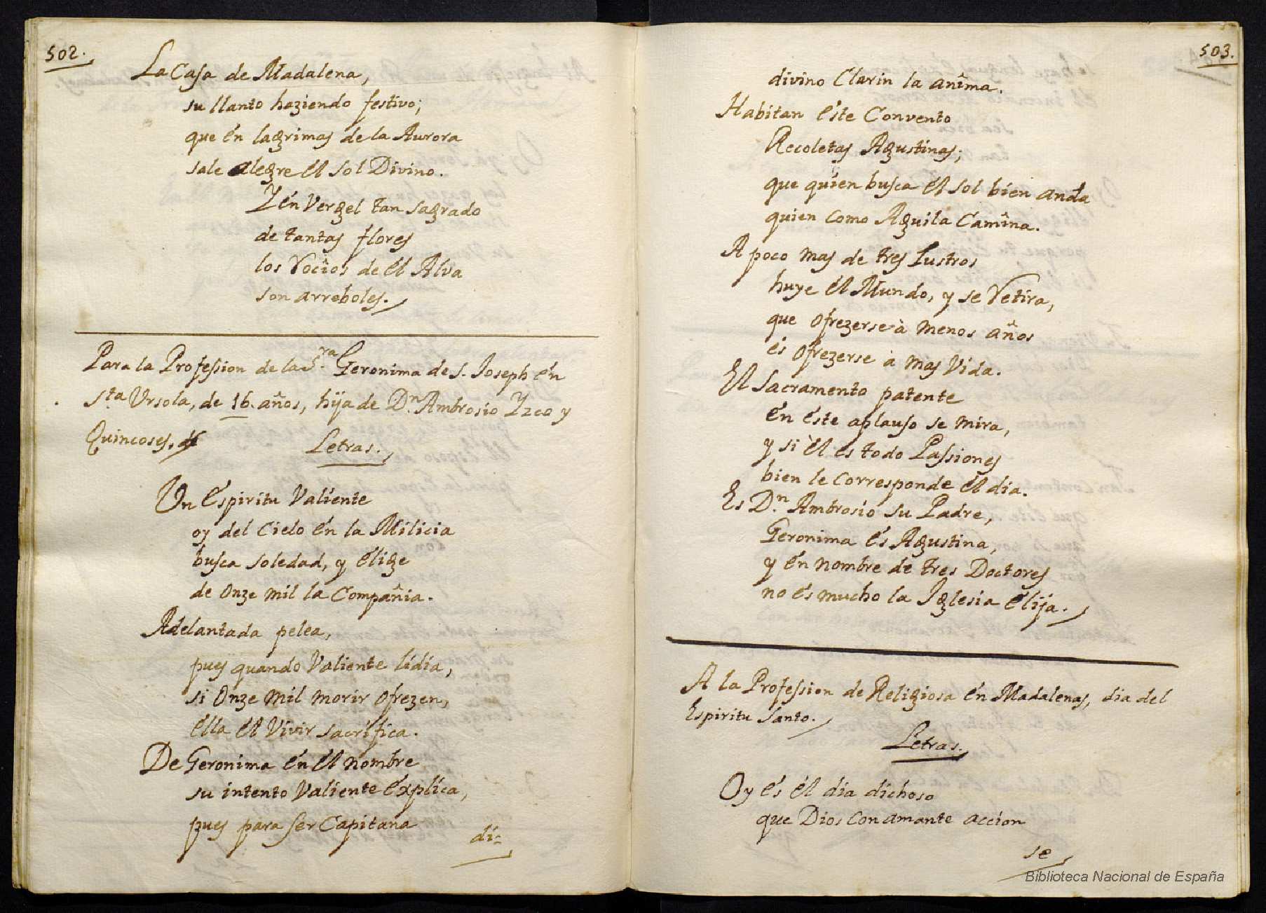 En la pp. 502-503, sin indicar la fecha, se copió la letra que se cantó “para la profesión de Gerónima de San José en Santa Úrsola, de 16 años, hija de D. Ambrosio Yzco y Quincoses”: