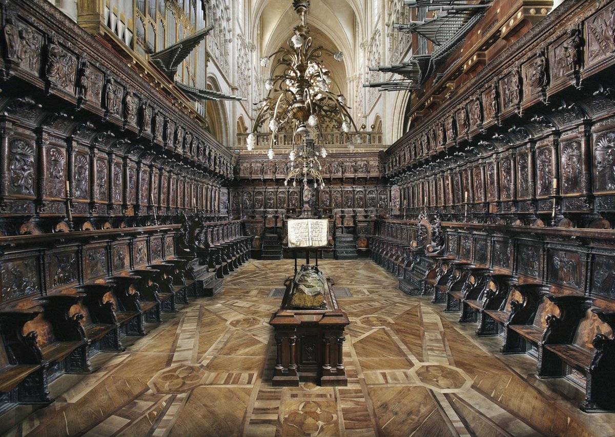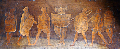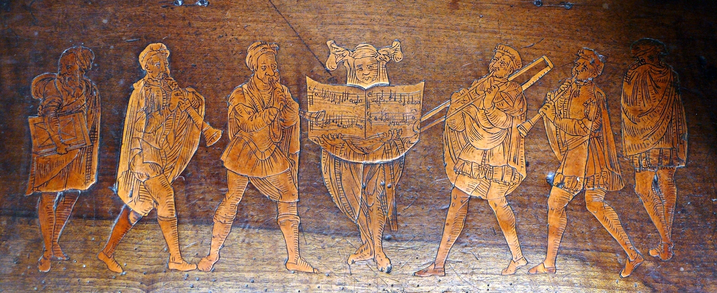 Nota: En el coro de la catedral de Burgos, encontramos el ejemplo iconográfico hispano más temprano de un grupo de ministriles tañendo desde un libro escrito en notación mensural blanca, similar a los que continuaron usando hasta bien entrado el siglo XVIII. Se trata de la taracea del asiento de la silla 2 de la sillería baja, contando de izquierda a derecha, atribuible a Andrés de Najera (1505-1512, ver recurso).