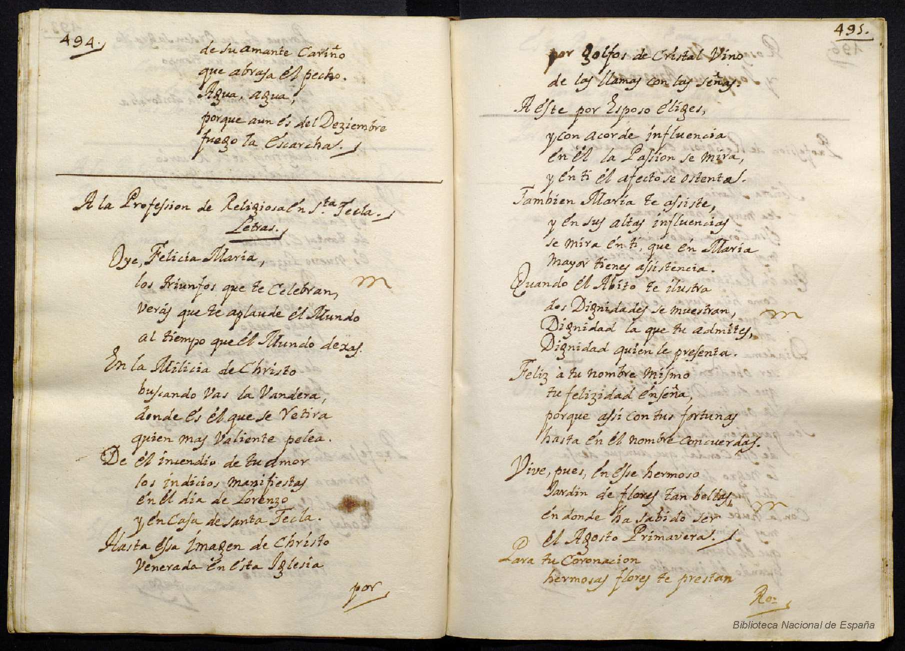 El segundo (pp. 494-496) se inicia con el verso “Oye, Felicia María”, en el que se indica, igualmente, el nombre de la monja que hacía la profesión. En este texto se hace alusión a la imagen del Cristo del Rescate que se veneraba en la capilla de la familia Medina y a que la ceremonia tuvo lugar en el mes de agosto.