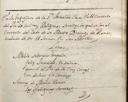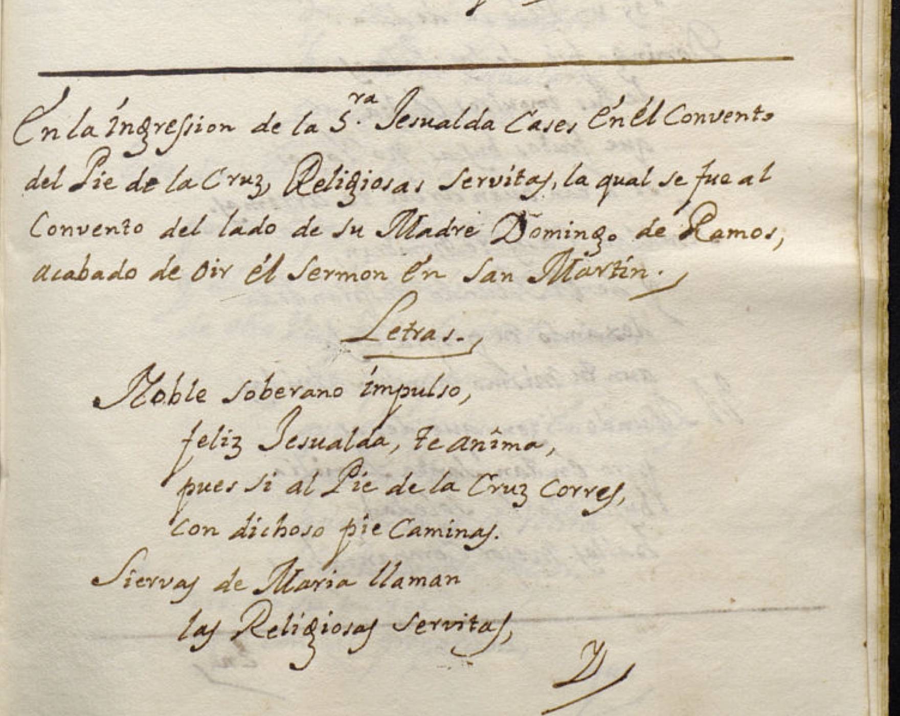 “En la ingresión de la señora Jesualda Cases en el convento del Pie de la Cruz, religiosas servitas, la cual se fue al convento del lado de su madre, Domingo de Ramos, acabado de oír el semón en San Martín”.
