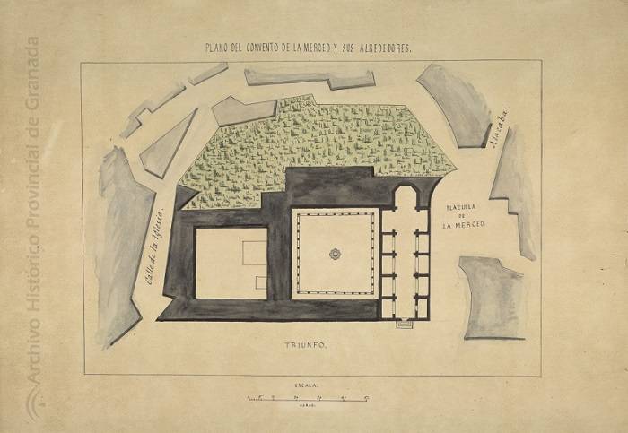 Fundado en 1492, el convento de Nuestra Señora de la Merced fue uno de los primeros que se estableció en Granada bajo el patronato de los Reyes Católicos. Ubicado en un primer momento en la margen izquierda del río Beiro (Hospital de San Lázaro), en 1514, el cabildo de la ciudad concederá a los mercedarios unos terrenos extramuros, junto al Campo del Triunfo y próximos a la puerta de Elvira, donde construirán un complejo de grandes dimensiones que el cronista Francisco Henríquez de Jorquera nos describe del siguiente modo: