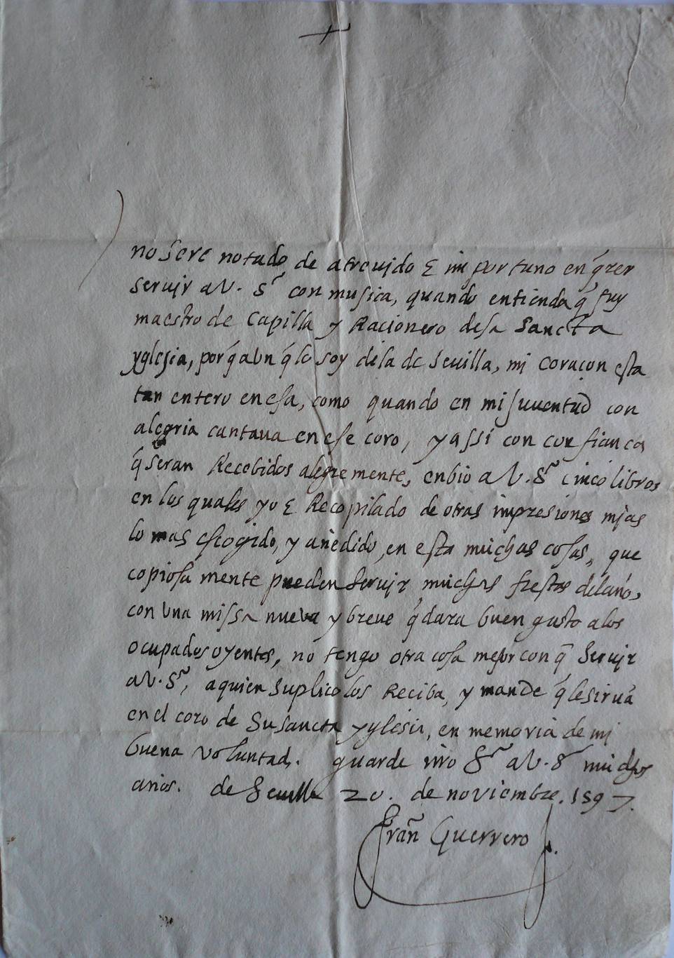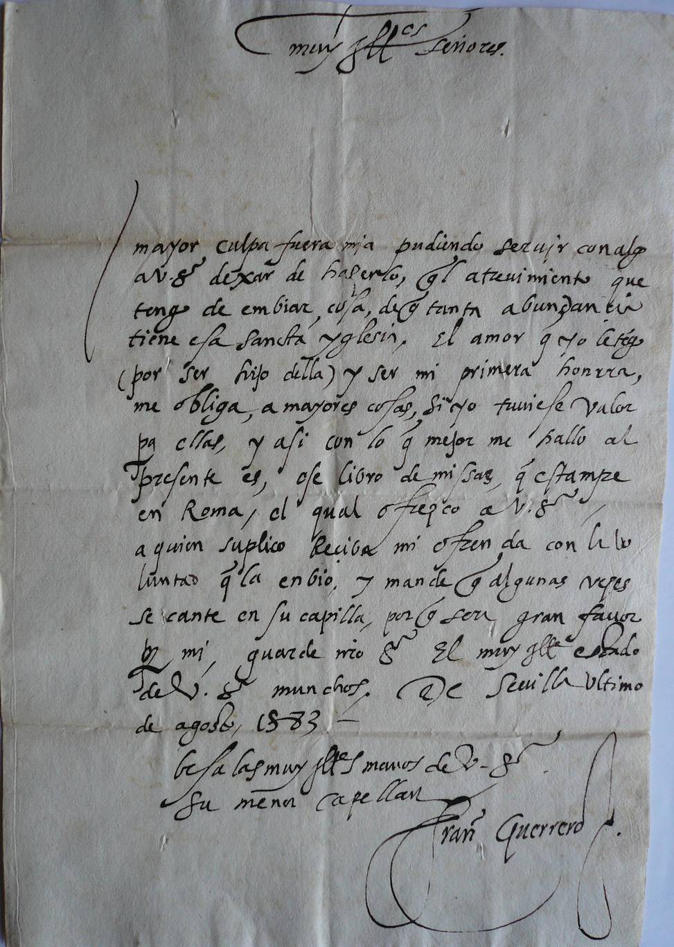 La primera está fechada en Sevilla, el 31 de agosto de 1583. Hace alusión a la rica Librería de música de la catedral de Jaén y a la vinculación que tuvo con ella (“por ser hijo della”). Con esta misiva remitía el Missarum liber secundus(Roma: Domenico Basa, colofón Francesco Zanetto, 1582) [G 4872], y pedía: “mande que algunas veces se cante en su capilla porque será gran favor para mí”. Las cuentas de Fábrica de la catedral nos permiten saber que el cabildo mandó a Guerrero una gratificación de 27 ducados (12.200 maravedís) por este impreso: “para que los inviase a la ciudad de Sevilla a el racionero Guerrero por un libro de misas que invió para esta santa iglesia”.