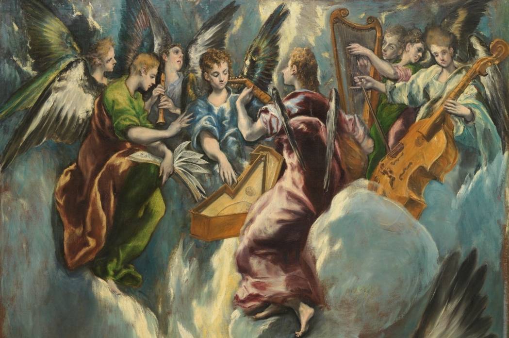 Música callejera, música de cámara, música de amueblamiento para acompañar banquetes o sesiones de posado... Dejando de lado paralelismos estéticos con el imaginario misticismo de Tomás Luis de Victoria, ¿qué música gustaría de escuchar el artista griego? Si a la cita de Martínez sumamos la presencia de instrumentos en los conciertos angélicos que pintó el Greco, vemos el protagonismo de vihuelas de arco, laúdes, espinetas o flautas de pico. Este conjunto cortesano y la variada y naturalista representación de las violas o vihuelas de arco ha llevado a imaginar a un Greco cuando menos conocedor de la música del Tratado de glosas sobre cláusulas y otros géneros de puntos en la música de violones (1553). "El Greco bien pudo escuchar los violones de su coetáneo Diego Ortiz y trasladar uno de ellos a este lienzo", escribieron Federico Sopeña y Antonio Gallego a propósito de La Anunciación del Museo del Prado. No es imposible, pero el Tratado (una obra didáctica, por otra parte) había aparecido en Roma un cuarto de siglo antes de que el Greco llegara a Toledo, y no hay constancia de que en esta ciudad perviviera el recuerdo de la música y quizás ni de la persona de Ortiz, pues hasta lo que sabemos, desarrolló toda su carrera en Nápoles.