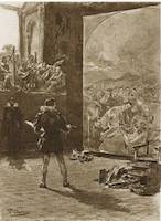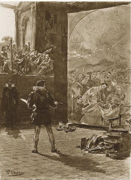 Desde 1577 y hasta su muerte en 1614 Domenicos Theotokopulos, conocido como El Greco, vivió en Toledo, la mayor parte del tiempo en unas estancias alquiladas en las casas del Marqués de Villena, cerca de lo que actualmente es el museo Casa del Greco (jardines del Paseo del Tránsito); al menos entre 1585 y 1590, y desde 1604 hasta su muerte. Una cita un tanto tardía (pero aceptada como verosímil), recogida por el pintor Jusepe Martínez (1601-1682) en su tratado de pintura, señala que “ganó muchos ducados, mas los gastaba en demasiada ostentación de su casa, hasta tener músicos asalariados para cuando comía gozar de toda delicia”. Un pintor de historia, minucioso y sensible como Ulpiano Checa (1860-1916), probablemente molesto de que el gran artista utilizara el bello arte de la música para acompañar una actividad tan poco espiritual como la comida (y desconociendo los usos antiguos), trasladó en su Le Fou Greco (1896) los músicos a una tribuna del estudio en que pintaba El entierro del Conde de Orgaz. Lo mismo haría, casi un siglo después (1974), el novelista Manuel Mujica Láinez (1910-1984) en El laberinto: "Alguna vez hasta trajo músicos y las cosas anduvieron mejor" en aquel taller en que posaban los nobles toledanos.