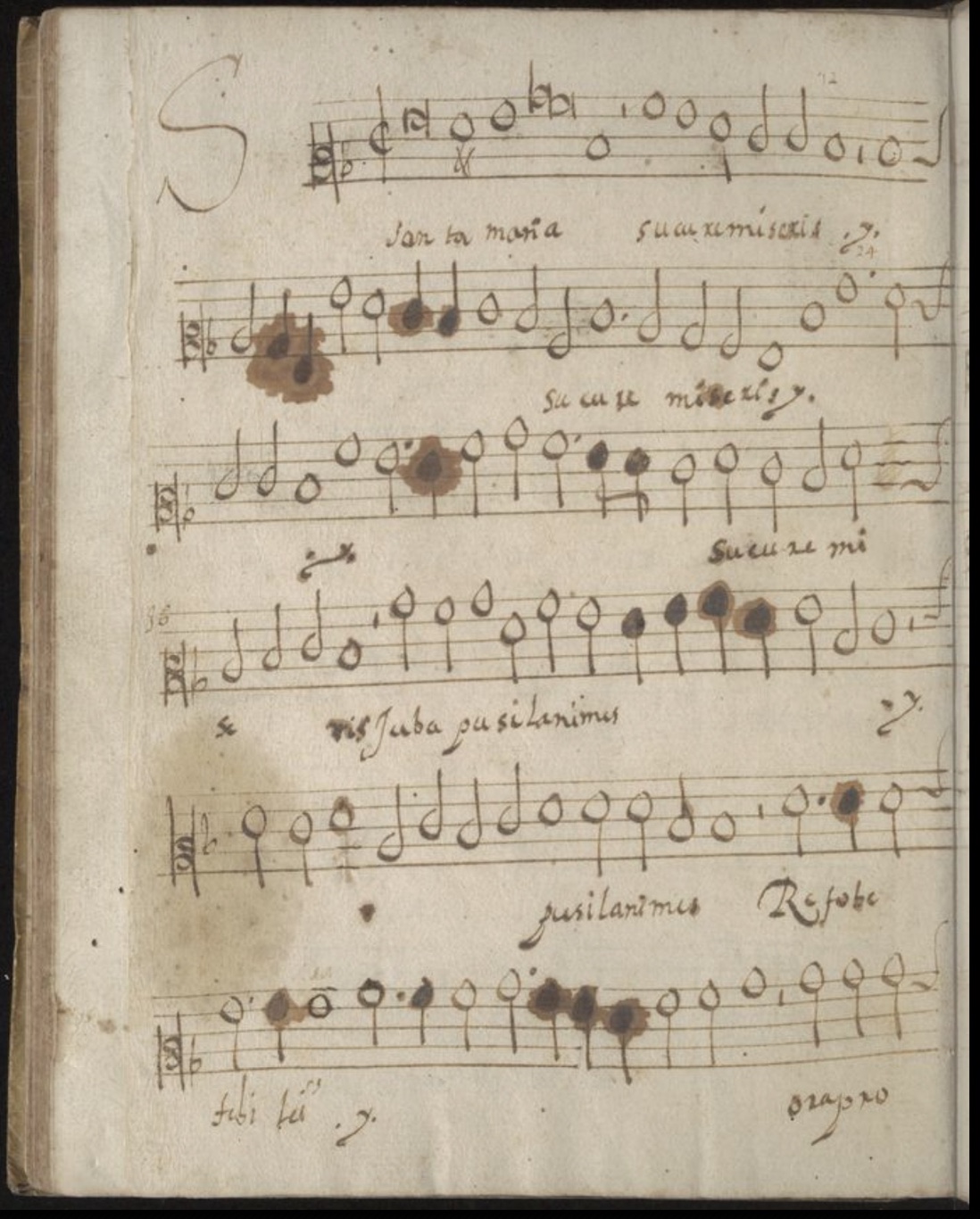 En el fol. 63v, puede leerse: “Copié a la Bibliotheque imperiale pendant le mois de février 1809. sur l'Exemplaire / in fol. max. coté (940. S.t Martin). Cette messe tombe en poussière et les notes qui / sont surlignées d'un trait ainsi / [...] / sont celles qui etaient rongées par l'humidite / du reste toutes les autres ont été fidellement copiées et existaient lors de la mise en partition”.