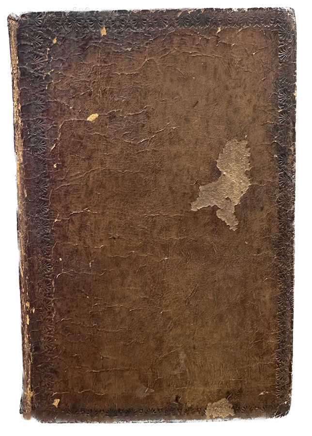 Está encuadernado en pasta dura, forrado de piel marrón, decorada con un motivo grabado que se repite a lo largo de todo el margen. Tiene un exlibris de la Folger Shakespeare Library pegado en la guarda posterior. En la portada hay un sello ovalado de color negro estampado. En el centro parece vislumbrarse el anagrama IHS y en óvalo exterior “LIBRERIA DEL COLEGIO”, lo que indicaría su pertenencia a una biblioteca jesuítica hispana (ver recurso).