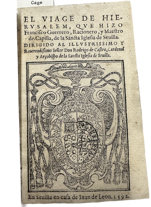 En la Folger Shakespeare Library [sig. DS106 .G8 1592 Cage], hay también un ejemplar de la edición príncipe de El viage de Hierusalem que hizo Francisco Guerrero (Sevilla: Juan de León, 1592). Este volumen perteneció a Sir Thomas Phillipps (1792-1872), coleccionista de libros y anticuario británico. Fue comprado por la Folger Shakespeare Library al librero Willian H. Robinson por tres libras en 1953. Agradezco a la bibliotecaria Erika Giddens la información proporcionada sobre este volumen.