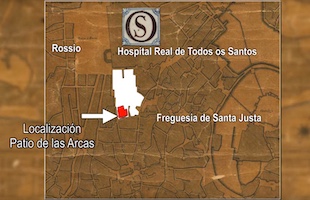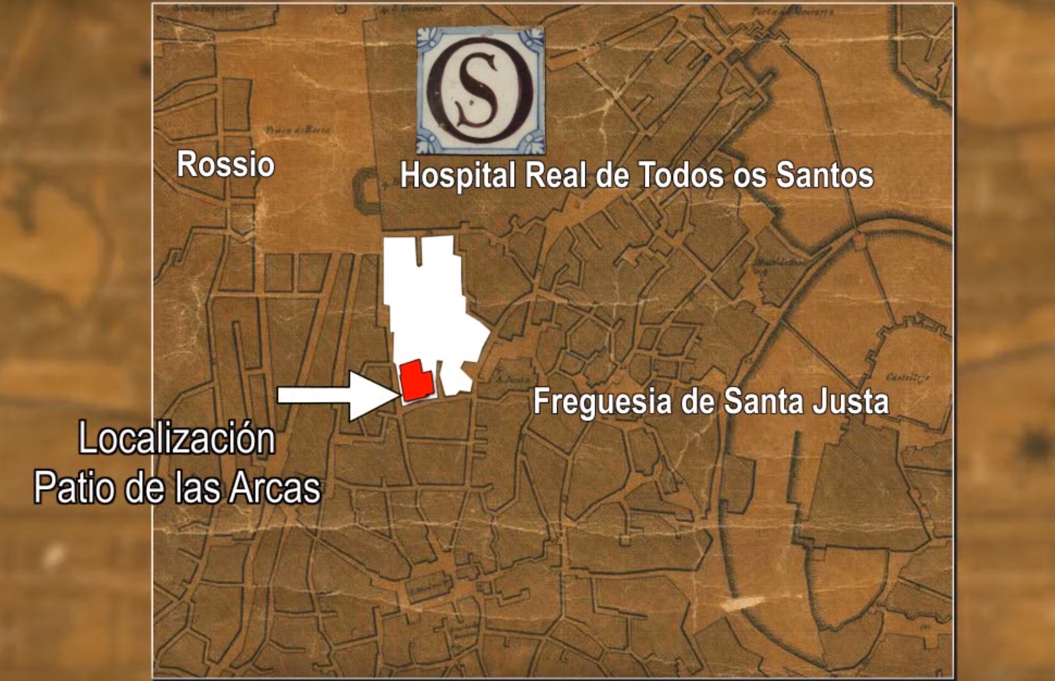 El Pátio das Arcas fue construido en la Rua das Arcas por un español, vecino de Lisboa, en la última década del siglo XVI, a semejanza de los corrales de comedias españoles. Estaba bajo la tutela del Hospital Real de Todos os Santos, institución perteneciente a la Misericórdia de Lisboa, que tenía el privilegio para la explotación del teatro público en la ciudad (véase su reconstrucción virtual en los recursos).