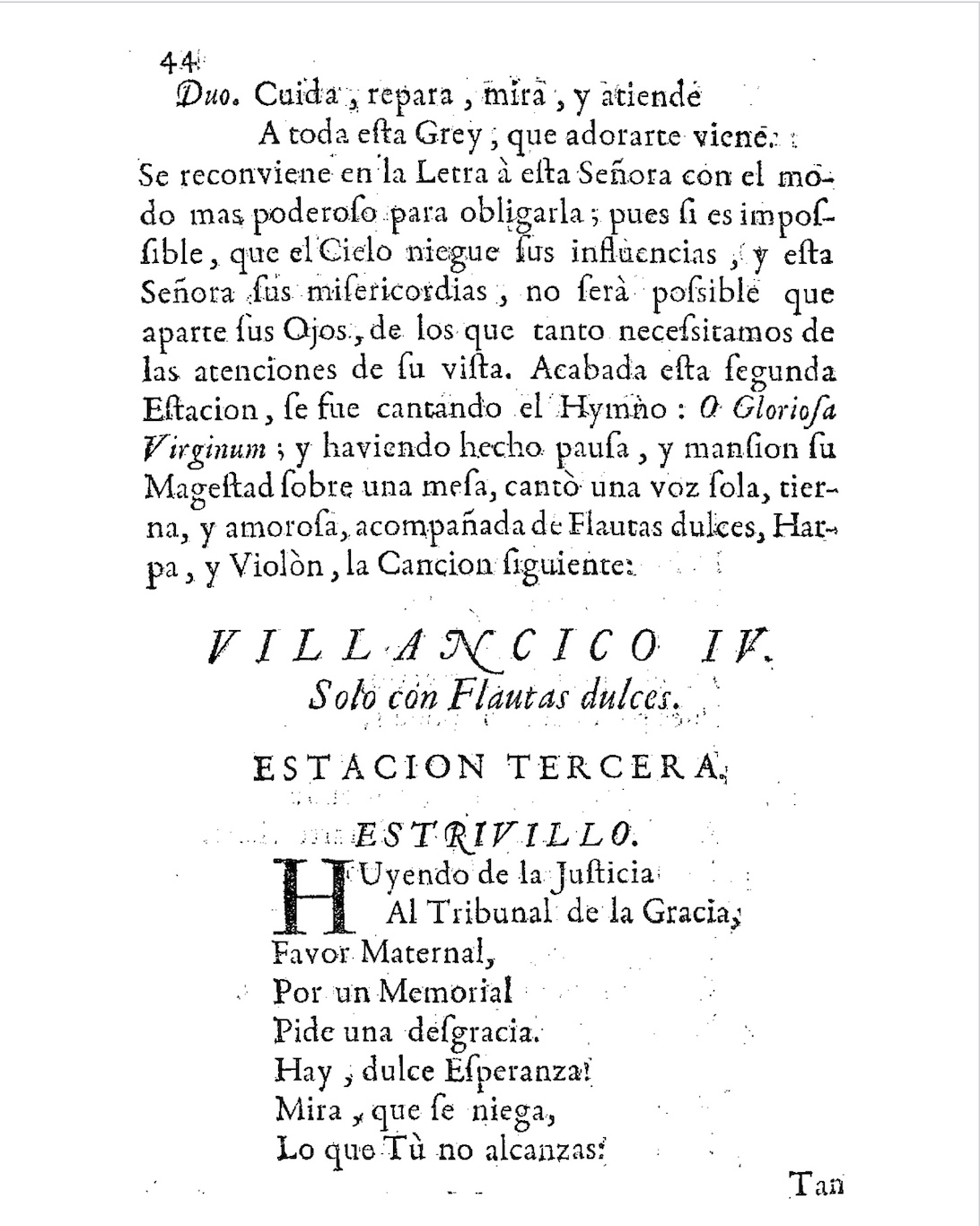 En el tránsito de la primera a la segunda estación se canto el himno mariano Quem terra pontus… adorant. Dispuesta la imagen de la Virgen sobre la mesa que se había preparado: “cantaron a dúo con flautas traveseras, arpa y violón, entre un tenor y un tiple, así dulce como halagüeño” el tercer villancico.