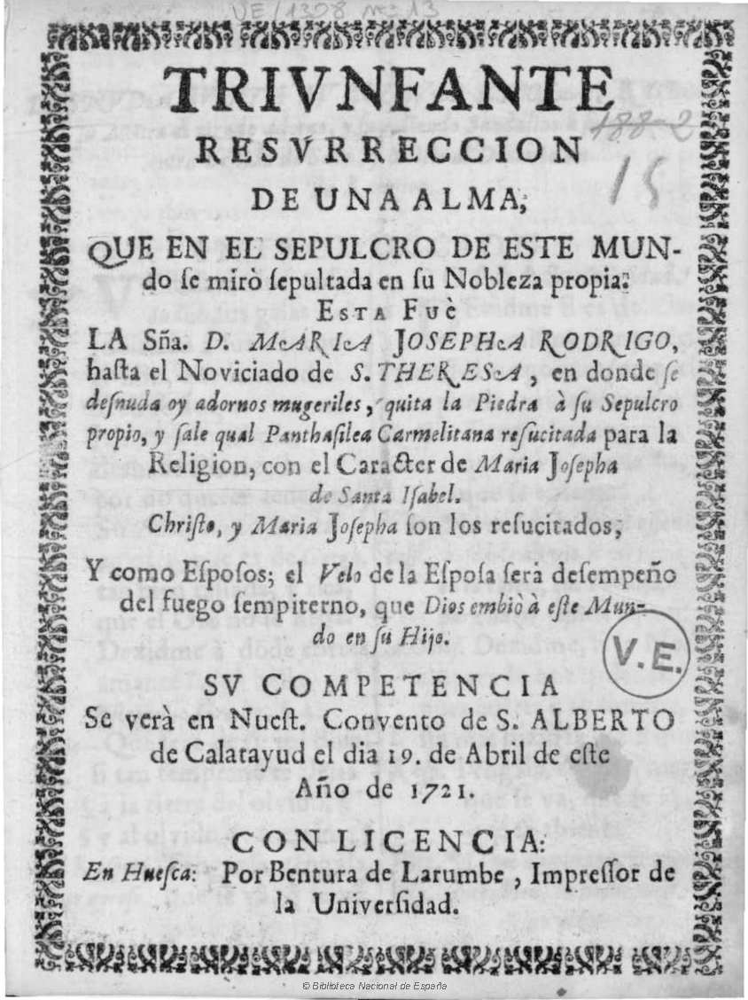 Triunfante resurrección de un alma que en el sepulcro de este mundo se miró sepultada su nobleza propia. Esta fue la señora María Josefa Rodrigo, hasta el noviciado de Santa Teresa, en donde se desnuda hoy adornos mujeriles, quita la piedra a su sepulcro propio y sale cual Pantasilea carmelitana resucitada para la religión, con el carácter de María Josefa de Santa Isabel… su competencia se verá en nuestro Convento de S. Alberto de Calatayud el día 19 de abril de este año de 1721. Huesca: Ventura de Larumbe, 1721.