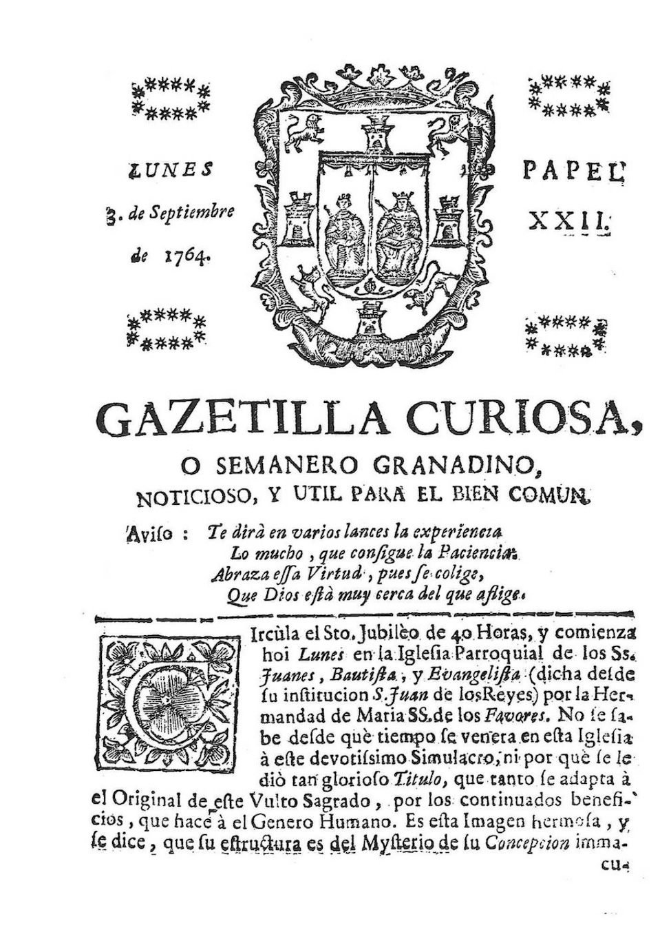Fray Antonio de Lachica Benavides cita ya esta cofradía sin su advocación mariana en la Gacetilla curiosa o Semanero granadino del 2 de julio de 1764 (papel XIII).