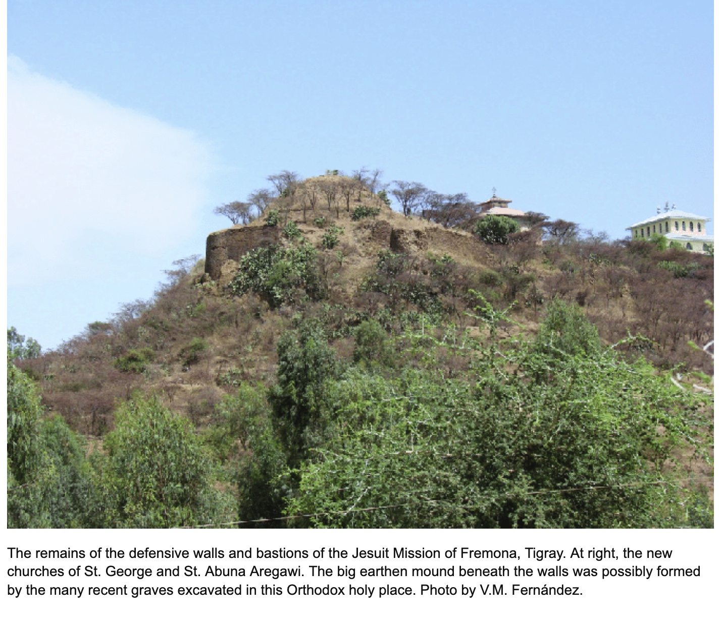 La misión estaba asentada en el extremo norte de una colina, rodeada por una muralla de carácter defensivo que comenzó su construcción en 1606. Esta muralla fue reforzada bajo la supervisión de Diogo de Mattos y, en torno a 1627, siguiendo la estela de las iglesias construidas en Gorgora, Gännätä Iyäsus and Innäbesse por el arquitecto español João Martins (= Juan Martínez) se inició la construcción en Fremona de un templo de similares características, ya que la que tenían era pequeña y aunque se había reformado seguía siendo insuficiente para la creciente comunidad católica de la región. El jesuita Manoel da Veiga (1566-1647), misionero también en Etiopía, en el libro primero de su obra Relacam geral do estado da christandade de Ethiopia (Lisboa: Mattheus Pinheiro, 1628) da cuenta de estas iglesias. Sobre la reedificación de la “igrejinha” en la que estaba la sepultura del patriarca Andrés de Oviedo nos informa que fue: