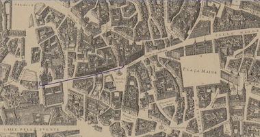La procesión general salía de la iglesia de Santiago, acompañada con todos los estandartes, clerecía y cofradías. El comisario general, portando la Bula, iba bajo palio, cuyas varas llevaban la justicia y regidores de la villa. Detrás iba el resto del cortejo: “y en la dicha procesión van las chirimías, trompetas y atabales de su Majestad”. A la salida de la iglesia del Salvador, se disponía una escuadra de alabarderos que se ubicaría delante de la procesión para abrir paso a la comitiva. Una segunda escuadra estaría en la iglesia de Santa María, la cual también se había ornado especialmente para la ocasión. Como se puede ver en el itinerario marcado en el plano de Pedro Texeira (ver recurso), el recorrido era muy corto. Una vez que el comisario general llegaba con la Bula a las gradas de la iglesia de Santa María, salía a recibirlo el presidente de Castilla, con algunos señores del Consejo Real y alcaldes de corte, que se colocarían detrás de él para continuar en procesión por la nave de la iglesia hasta llegar a las gradas del altar mayor. Aquí se habría dispuesto otro “altar” para colocar la Bula, la cual permanecería en este lugar hasta que se acabaran los oficios, con dos velas encendidas a los lados.