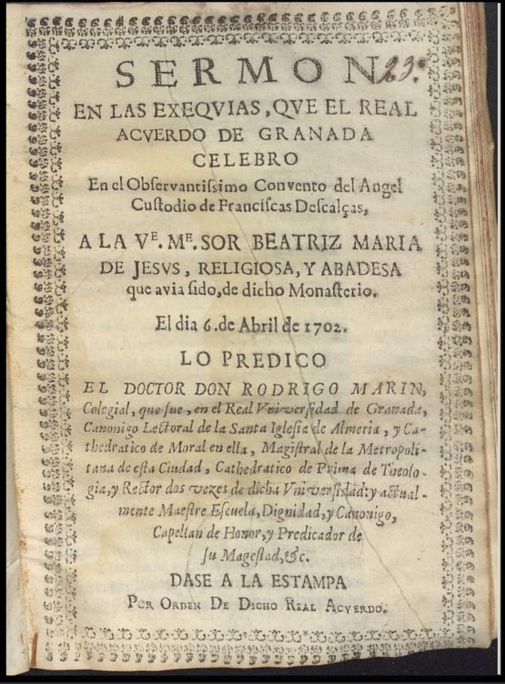 - El Real Acuerdo de la ciudad, el día 6 de abril, predicando Rodrigo Marín, canónigo y maestrescuela de la catedral de Granada.