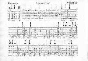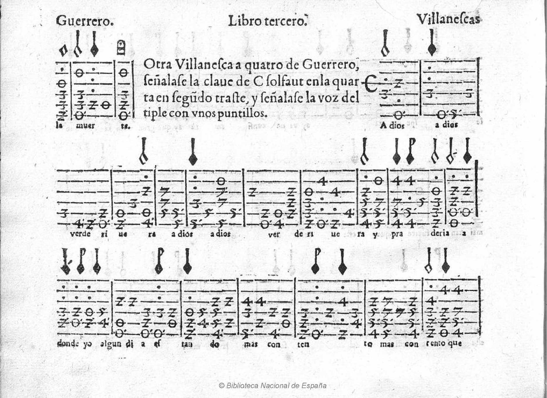 * Fols. 87v-88v. Adios, verde ribera y pradería. “Otra villanesca a cuatro de Guerrero, señálase la clave de Csolfaut en la cuarta en segundo traste y señálase la voz del tiple con unos puntillos”.